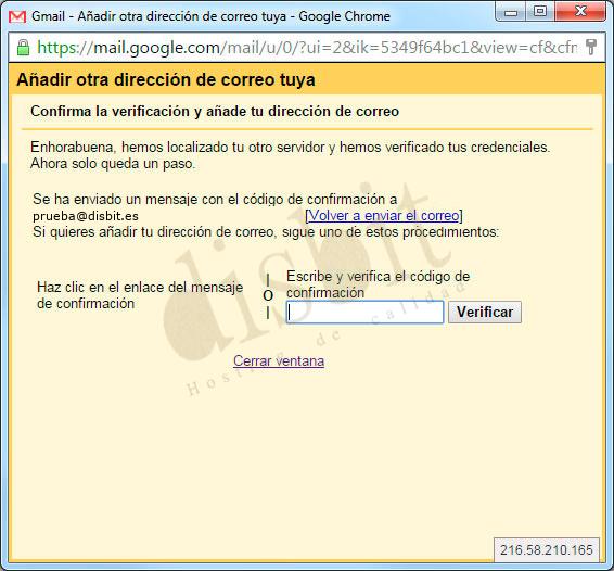 - ● Ahora Google nos pedirá verificar la cuenta de correo con un código que nos envía por e-mai a la cuenta de correo externa. Copiamos el código que nos facilita, lo escribimos en el campo que aparece en la imagen y hacemos click en "Verificar".