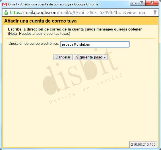 - ● Escribimos la dirección completa de la cuenta de correo que queremos configurar y hacemos click en "Siguiente paso".