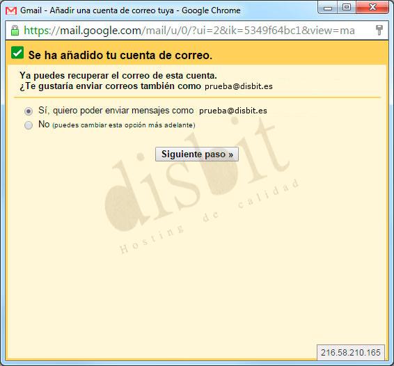 - ● Ya tenemos configurado la recepción o entrada de mensajes, ahora vamos a configurar la salida o envío. Hacemos click en "Siguiente paso" como en la imagen.